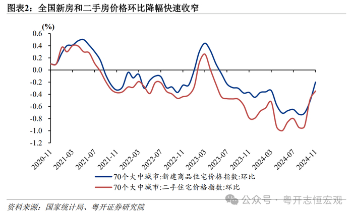 从新房看,2024年新房销售“以价换量”,销量同比在11月由负转正,而房价同比跌幅较大。从量看,增量政策降低购房门槛,刺激了改善性需求,新房销售明显好转。前三季度新房销售同比下降明显,但926政治局会议以来房地产新政密集出台,推动居民购房需求回升。根据住建部数据,10—11月,全国新建商品房交易网签面积连续两个月同比和环比双增长,结束连续15个月下降。根据统计局数据,11月,新房销售面积和销售额同比由负转正,分别实现正增长3.2%和1.0%;一线等重点城市销售改善更为明显,11月当月分别增长10.2%和6.8%。今年商品住宅销售面积累计同比跌幅呈逐月收窄态势,前11月,商品住宅销售面积累计同比-16.0%,跌幅较年初收窄8.8个百分点。从价看,全年商品房市场信心尚未全面修复,房价同比跌幅仍较大。10月末,70个大中城市新建商品住宅价格同比下跌6.2%,跌幅创新高,11月同比降幅收窄至-6.1%;在增量政策刺激下,市场预期边际好转,全国新房价格环比降幅明显收窄,一线城市新房价格环比止跌,11月一线、二线、三线城市新建商品住宅价格环比分别为0.0%、-0.1%、-0.3%。
