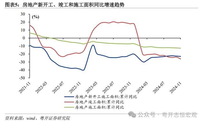 2、投资:房地产投资同比加速下降,这是前期销售低迷的结果,但从长期看房地产供给减少有利于形成新的供需平衡。1-11月全国房地产投资累计同比-10.3%,自2022年以来连续三年拖累经济增长;投资持续下滑是行业主动去库存的结果,从长期看供给减少有利于促进行业供需再平衡。