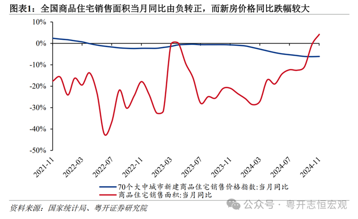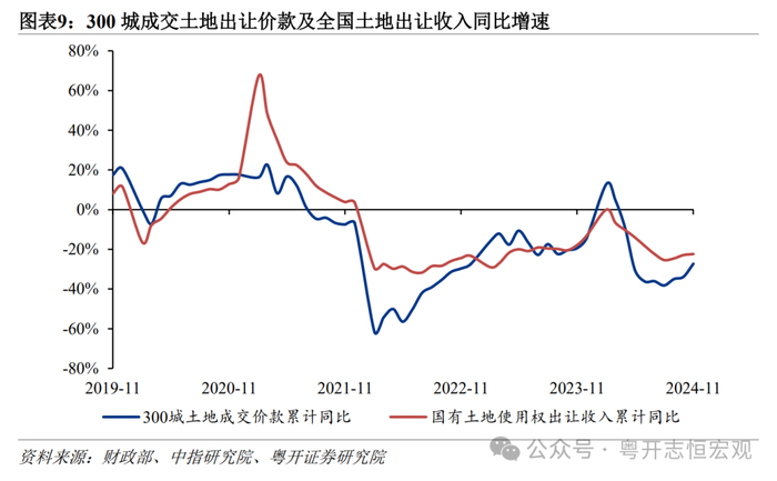 2024年,本轮房地产下行周期已进入第三年。从累计增速看,房地产销售、价格、投资指标从2021年见顶之后,2022—2024年连续三年下行。与2021年市场高点相比,2024年1-11月商品房销售面积、销售金额累计分别下跌45.5%、47.3%,其中住宅销售面积、销售金额跌幅均已接近50%;房地产投资累计下跌31.8%、新开工面积累计下跌63.2%,拖累房地产施工相关建安工程投资。从当月增速看,新房销售面积增速呈现前低后高走势,前三季度新房销售同比下降明显,但926政治局会议以来房地产新政密集出台,推动居民购房需求改善,销售出现触底反弹信号。但房地产投资仍持续低迷、土地出让收入下滑冲击地方财政、房地产企业债务风险仍需进一步化解。
