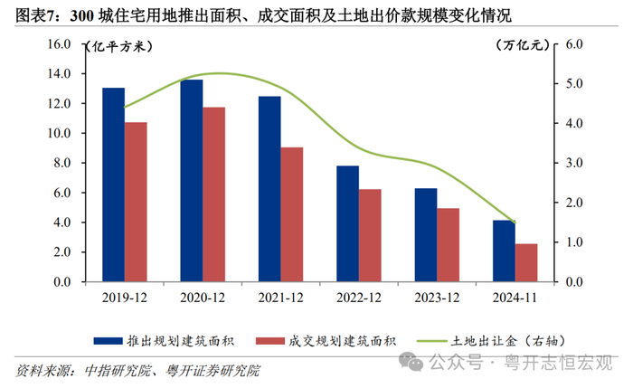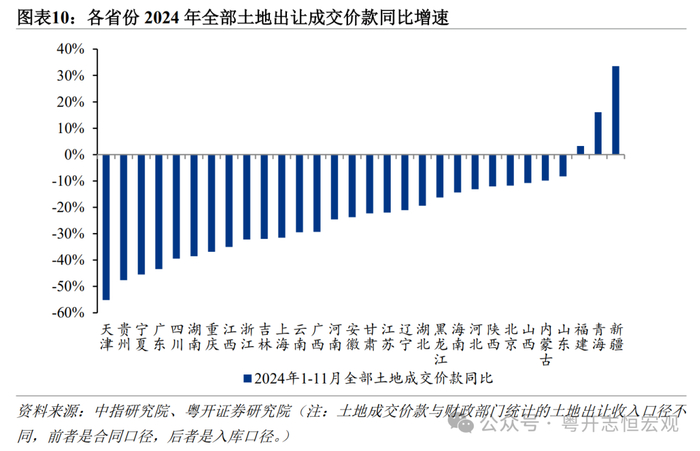 从区域结构看,全国土地市场整体下行、区域分化加剧。商品房销售拖累住宅用地需求,全国土地出让价款同比跌幅较大。2024年1—11月,300城全部土地成交价款同比下降30.5%,住宅用地出让价款同比下降31.8%。根据中指数据,2024年1—11月,300城全部土地出让成交价款同比下降27.3%,跌幅大于财政部实际缴库的土地出让收入降幅(-22.4%)。分省份看,经济大省土地出让下行压力更大。1—11月,全国31省份全部土地出让价款累计同比-25.1%;除新疆、青海、福建外,28个省份土地出让价款同比负增长,广东、四川、重庆、浙江土地出让价款同比分别为-43.4%、-39.5%、-36.9%、-32.2%。分城市看,一线城市中广深土地出让市场的跌幅扩大,但一线城市整体土地市场表现仍好于二三线以下城市。2024年1—11月,35个大中城市各类用地土地出让价款同比下降30.1%;一线城市、二线城市住宅用地成交价款分别下跌28.9%、39.3%。具体来看,一线城市中,北京土地出让价款同比-12%,跌幅相对较小;而上海、广州、深圳1—11月土地出让价款分别-31%、-47%、-47%。二线城市中,除了济南、福州正增长以外,天津(-53%)、南京(-48%)、成都(-48%)、青岛(-47%)、杭州(-31%)多数城市土地出让价款同比跌幅较大。由于二线以下城市下滑程度更大,一线城市1—11月住宅用地土地出让价款占300城的份额达22.0%,较2023年提升3.1个百分点。