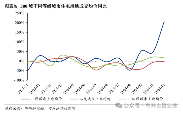 3、土地市场:土地出让成交规模整体萎缩、区域结构更加集中,一线城市土地成交占比上升。从全国看,土地成交面积、土地出让收入大幅下降。1—11月全国300城住宅用地推出规划面积、成交面积同比双双下降,300城住宅用地出让价款同比下降31.8%;28个省份土地出让价款同比负增长,广东、四川等经济大省跌幅较大。从地方看,区域分化加大,一线城市土地市场升温、土地出让收入占全国比重继续上升。9月以来,一线城市成交土地均价、楼面价、溢价率等指标环比回升,北京、上海等核心城市拍出高总价、高溢价地块;1—11月一线城市住宅用地土地出让价款占300城的比重达22.0%,较2023年提升3.1个百分点。