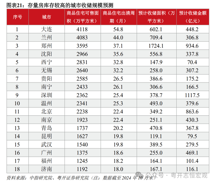 2、库存:增量政策力度大、资金足,2025年存量房库存去化有望加快。2025年财政支持专项债保障房收储、货币化安置支持城中村改造等政策有望加快去库存。选取当前可售住宅库存过高的18个城市,初步测算收储规模将达0.77亿平方米,收储金额规模达0.70万亿元。
