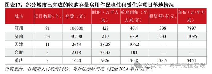 2024年存量商品房收储启动,制定收储政策的城市较多。各城市落实消化存量房产和优化增量住房的政策,利用央行再贷款政策收购存量商品房用作保障性住房。截至11月末,已有超过50个城市发布政策文件支持国有企业收储,制定房源征集细则等,包括广州、深圳等核心一二线城市,也有惠州、江门等三四线城市。但政策落地仍处于早期阶段,目前完成收储并转为保障房投入运营的城市并不多,仅在郑州、济南、天津、重庆、青岛等少数城市有项目落地。郑州、济南收储面积分别达428万、210万平方米,分别占10月末城市商品住宅库存的15%、21%。方式上,地方政府收储以存量未售新房为主,二手旧房的规模很少;范围上,收购的商品房多是100平米以下的小户型为主,集中在高库存且存在保障性住房缺口的二线以下城市;用途上,收购项目大多用于配租型而非配售型保障房。
