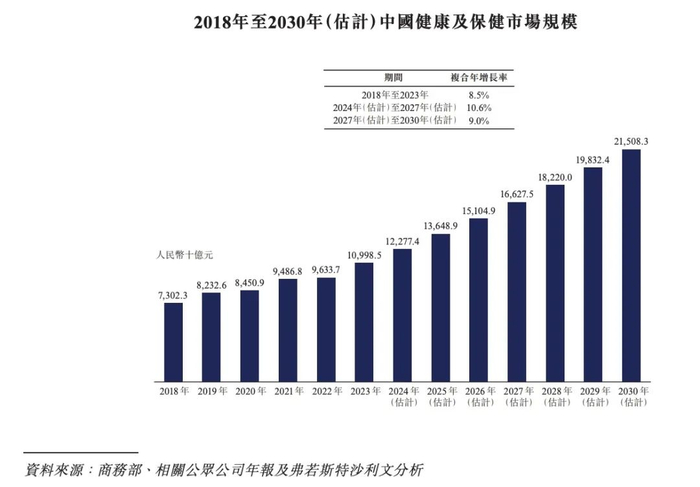 根据弗若斯特沙利文的数据,中国健康及保健行业的市场规模由2018年的7.3万亿元增长至2023年的11.0万亿元,2018年至2023年的复合年增长率为8.5%;预期将由2023年的11.0万亿元进一步增长至2027年的16.6万亿元,预计2023年至2027年的复合年增长率为10.9%。2030年,预计中国健康及保健行业的市场规模将达到21.5万亿元。