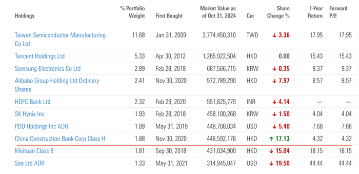 规模76亿美元的新兴市场基金 MFS Emerging Markets Equity A,10月份加仓建设银行3.98%,建设银行为其第六大重仓股。
