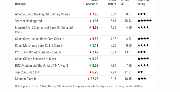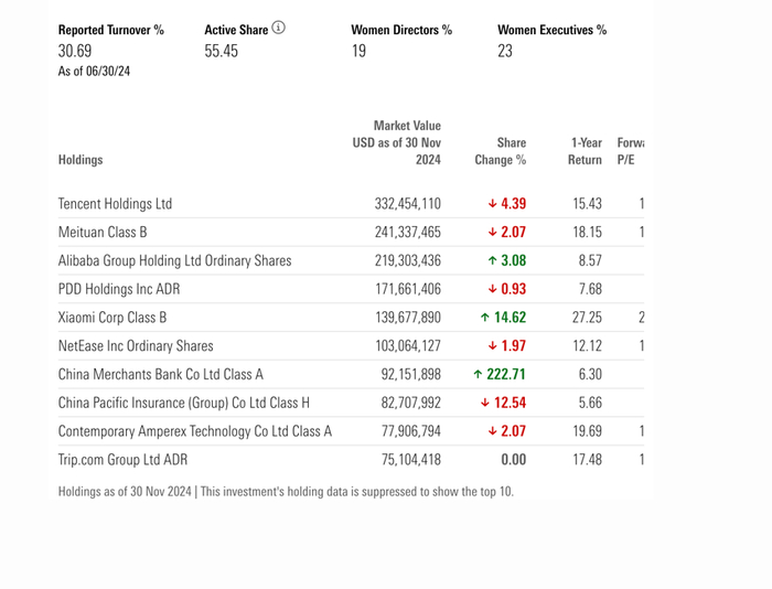晨星数据显示,摩根资产管理旗下投资中国的基金JPM China A (acc) USD,最新管理规模为33亿美元。2024年11月,该基金大举加仓招商银行。截至11月底,其前十大股票持仓为腾讯、美团、阿里巴巴、拼多多、小米集团、网易、招商银行、中国太保、宁德时代、携程集团,当月对招商银行的加仓幅度高达222.71%,加仓后约持有9215万美元的招商银行A股股份。