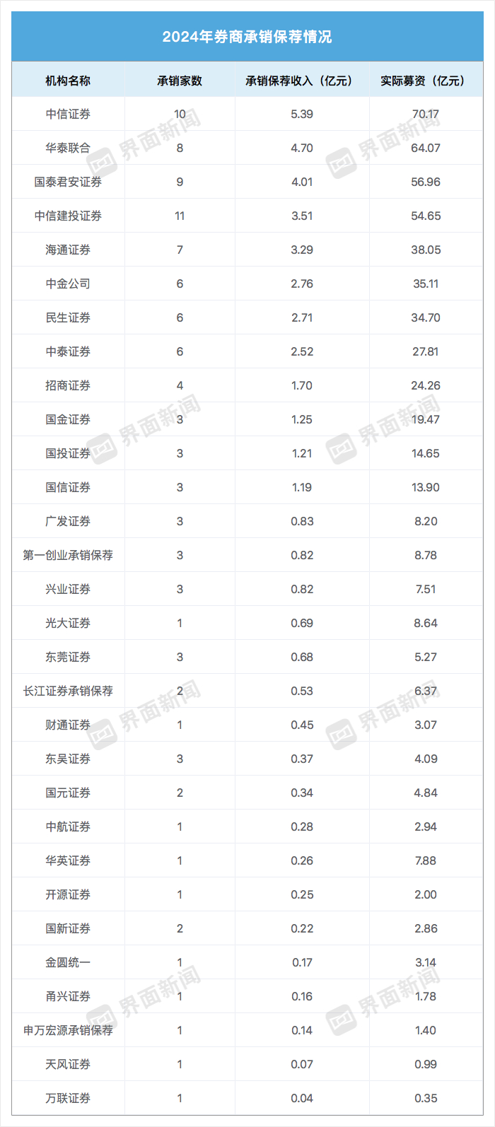 相较去年同期不同是,2024年国信证券(1.19亿元)掉出前十位列第十二;申万宏源承销保荐则下滑19位排在第二十八位。
