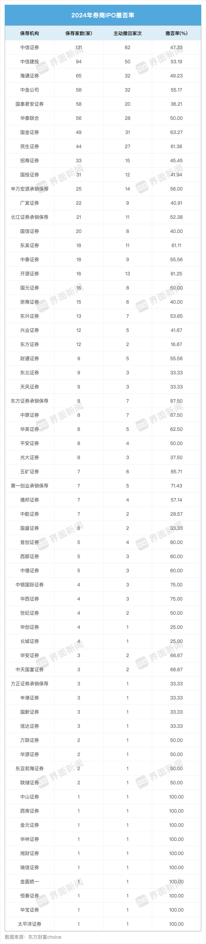 有投行人士分析称,“撤否率单一指标不足以全面评估券商的保荐表现。撤否率受IPO撤销案例比例的影响,与券商保荐的项目数量无关。在相同数量的撤销案例下,保荐较少项目的券商通常会有较高的撤否率。”