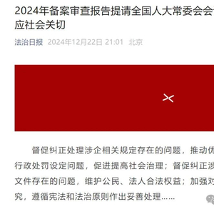 12月22日,全国人大常委会法制工作委员会关于2024年备案审查工作情况的报告提请十四届全国人大常委会第十三次会议审议。报告公布了多起典型案例,积极回应社会关切。