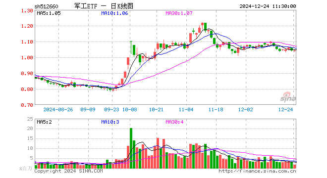 12月24日,截止午间收盘,军工ETF(512660)涨0.10%,报1.043元,成交额1.84亿元。军工ETF(512660)重仓股方面,中国船舶截止午盘跌0.36%,中国重工跌0.62%,中航光电跌0.41%,航发动力涨0.89%,中航沈飞跌0.29%,中航西飞涨0.19%,光启技术跌0.57%,中航机载涨0.25%,中国动力跌0.94%,菲利华跌1.91%。
