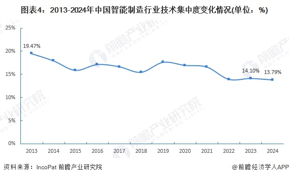 智能制造为技术密集型产业,技术创新对行业发展至关重要。从专利集中度来看,2013-2023年我国智能制造产业专利集中度呈波动下降趋势,专利申请量排名前十的企业合计占比在14%-18%左右,行业专利技术较分散。整体来看,我国智能制造产业生态涉及环节众多,包括基础硬件、基础软件、云计算、装备制造、系统集成等,各细分环节的行业龙头明显,但尚未出现行业整体龙头企业,市场集中度不高。