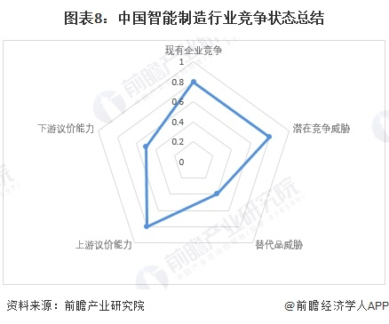从五力竞争模型角度分析,目前我国智能制造行业企业数量较多,但具有较强品牌优势的企业数量相对较少,且智能制造企业提供的产品具有一定的差异性,竞争压力较大;上游产品供应数量较多,但由于国内智能制造行业整体技术水平落后国外先进企业,部分关键零配件被少数国外企业控制,国内市场依赖进口,使得上游供应企业对智能制造行业议价能力较强;下游和中游链接紧密,智能制造市场需求旺盛,消费者议价能力一般;智能制造是未来制造业转型的重要发展方向,目前尚不存在替代品,替代品威胁较弱;新进入者方面,由于目前我国制造业智能化转型的大趋势已成,且有国家政策的大力扶持,新进入者的威胁较大。