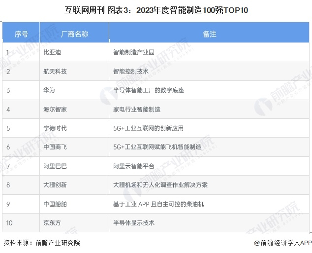 2023年11月,由中国科学院主管、科学出版社主办的商业期刊《互联网周刊》(CIW)联合德本咨询(DBC)、中国社会科学院信息化研究中心(CIS)发布了“2023年度智能制造100强”,比亚迪、航天科技和华为位列2023年智能制造百强榜前三位,紧随其后的是海尔智家、宁德时代、中国商飞、阿里巴巴、大疆创新、中国船舶和京东方。