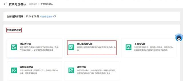 进入页面后,在“用票业务功能”模块,点击【出口退税类勾选】,进入勾选发票界面。