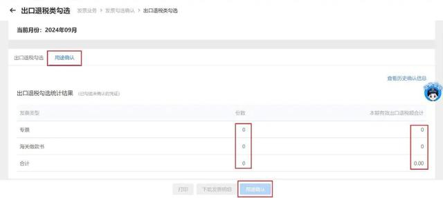 提交完数据后会跳出弹窗,对勾选发票信息进行用途核对,确认无误后点击【用途确认】。