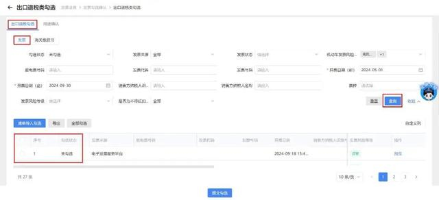 在“出口退税类勾选”界面,选择【出口退税勾选】模块的凭证类型为【发票】,根据需要输入或选择相关查询条件,点击“查询”,勾选需要申报的增值税发票,点击【提交勾选】。
