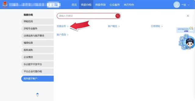 登录新电子税局后,点击【我要办税】-【税务数字账户】-【发票业务】功能菜单。