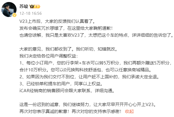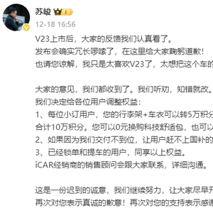 因此,在上市48小时内,智米科技创始人CEO、iCAR汽车首席产品官苏峻火速道歉:“大家的意见,我们都收到了。我们听劝,知错就改。”同时,苏峻还在社交媒体紧急调整用户权益,赠送5万积分,加上原本的行李架和车衣配置转换的5万积分,用户可0元兑换“科技舒适套装”,解锁L2级辅助驾驶功能。另外,如果用户因交付不到位赶不上国补,iCAR承诺大定全退。已锁单和提车的用户,同享以上权益。