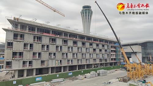 目前,加速推进中的乌鲁木齐机场改扩建工程。一座高耸的塔台直冲云霄,银白色的塔身与周围的天空融为一体。
