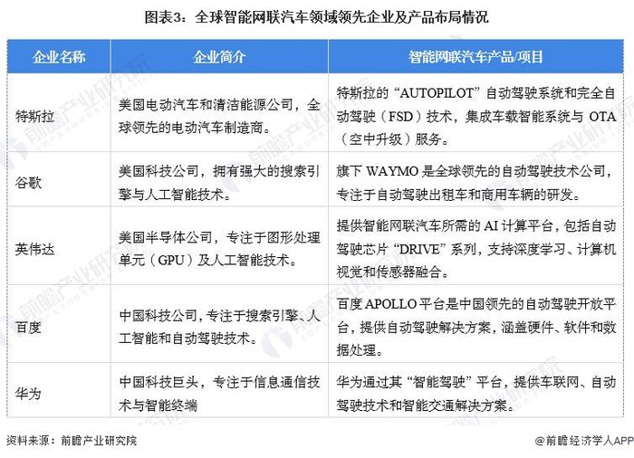 全球智能网联汽车的主要竞争者有汽车制造厂商和互联网科技企业。传统汽车制造商如特斯拉、福特、奥迪和戴姆勒,依托其强大品牌和技术积累,推动自动驾驶和车联网技术。科技公司如谷歌(Waymo)、英伟达、百度等,以AI和大数据优势深耕自动驾驶及智能平台。