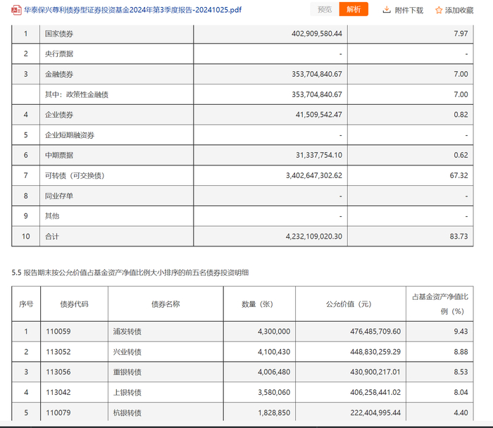 可转债也一直是华泰保兴的重点配置债券品种。截至2024年三季度末,该基金持有可转债的市值为34.03亿元,占基金净值之比为67.32%,前五大重仓可转债分别为浦发转债、兴业转债、重银转债、上银转债和杭银转债,合计占比39.28%。
