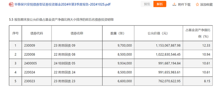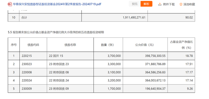 以最大的品种23附息国债09为例,华泰保兴安悦从二季度末的1.97亿元增加至11.53亿元,短短一个季度内就增加了9.56亿元,《财中社》梳理公开信息发现,该债券发行额为230亿元,光华泰保兴安悦债券就持有该债券近5%的发行额。