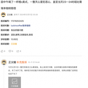 另有名为勇敢喵的用户12月2日上传的投诉帖显示,其于11月29号购买瑞幸咖啡喝出虫子,本想不追究,但过了三天依旧反胃恶心,要求商家赔偿。
