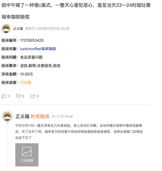 “正义喵”表示其12月11日确诊为食物中毒急性肠胃炎,而瑞幸官方回复是补偿两张咖啡券,至于承诺的去调查门店未兑现。
