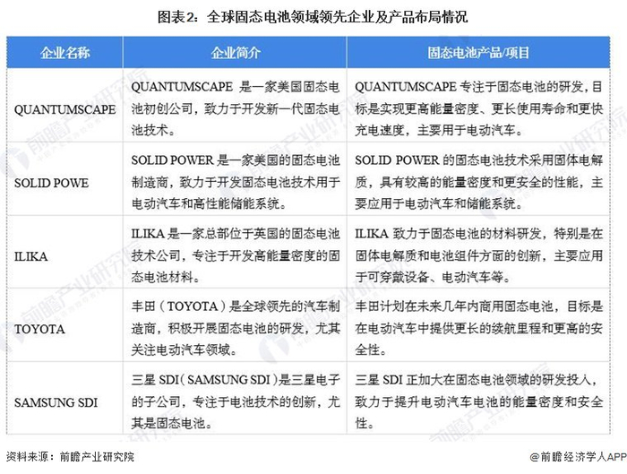 目前,全球固态电池技术仍处于研发投入阶段,暂无明确的行业龙头企业,当前QuantumScape、Solid Power和Toyota等企业在固态电池技术研发方面处于相对领先地位,重点突破固态电池的能量密度、安全性和充电速度。QuantumScape专注于电动汽车领域,Solid Power则与多家车企合作开发固态电池技术。丰田和本田等传统汽车制造商也积极推动固态电池的商业化应用。