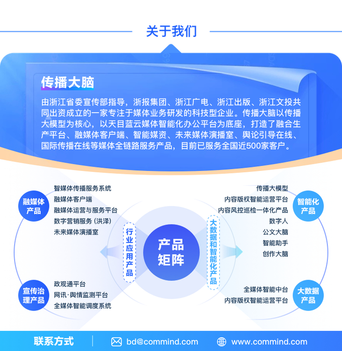 作为媒体行业的数智基建,传播大脑旗下产品——全媒体智能中台,已为多家媒体提供全渠道数据接入与集成、‘一张网’统一用户识别、用户标签画像生产、用户分类及深度洞察等多元服务,实现全域全场景的数据资产统一沉淀与管理,数据智能驱动业绩增长。