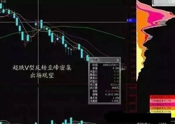 股价出现快速下跌行情,跌破原来的单峰密集,随后股价一路下跌,直到跌至超跌区域,但是此时看到原来的单峰密集依然存在,上方筹码被套牢不会卖掉,所以后期的阻力位也会非常明显,超跌之后会出现V型反转态势,确认形态后投资者可大胆跟进,后期反弹到原来单峰密集区域的时候可离场观望。