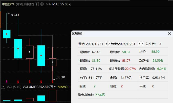 与汇川技术早在2010年就已在创业板上市不同,中控技术是在2020年11月才登陆科创板,正赶上那波赛道股行情的尾声,因此,从上市起,股价几乎就一直处于震荡下行状态。截至12月24日,公司股价自2021年至今下跌24.59%。同期,科创50跌幅为27.21%。