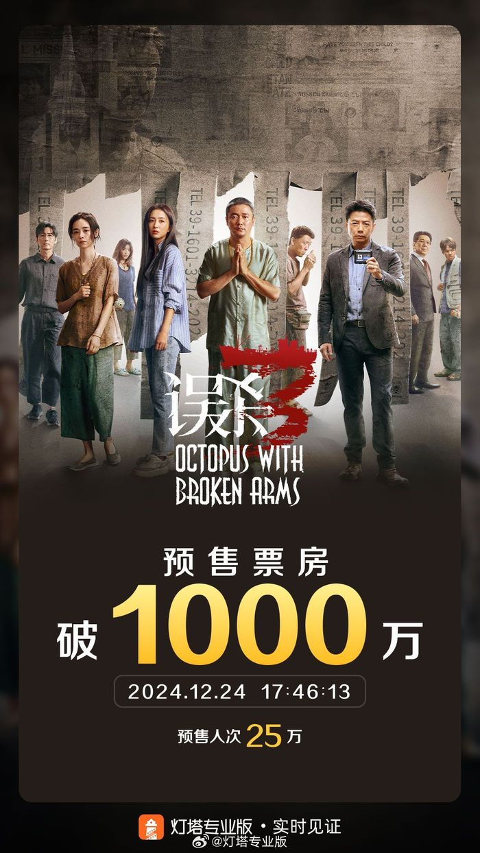 据灯塔专业版实时数据,截至12月24日17时46分,影片《误杀3》预售总票房突破1000万。
