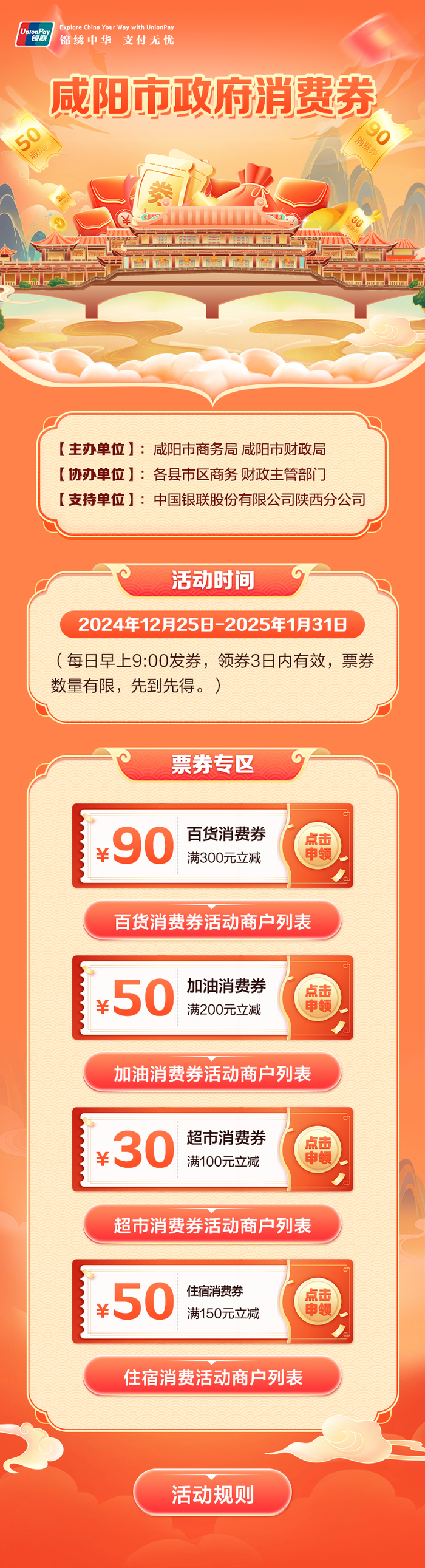 消费券类型包括:百货、商超、成品油、住宿等四大类,发放时间为2024年12月25日至2025年1月31日,每日上午9时发券,领券3日内有效。