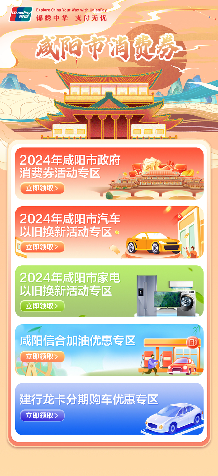 申领方式:消费者在活动规定时间内,通过“云闪付APP”“首页”—“陕西消费券”—“咸阳市”—“咸阳市政府消费券活动专区”申领使用电子消费券,单用户单周每档票券限领用1张,百货满300元立减90元、加油满200元立减50元、住宿满150元立减50元、超市满100元立减30元。