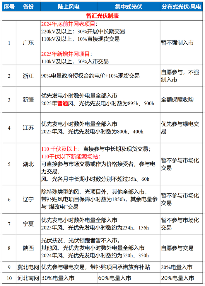 随着年底的临近,各省陆续发布2025年市场化交易规则,并对新能源项目入市做出安排。本文统计了10个地区2025年的新能源入市原则,汇总如下表所示。