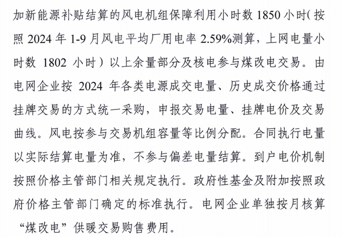 带补贴风电项目,保障小时数为1850小时,其余电量参与“煤改电”交易。