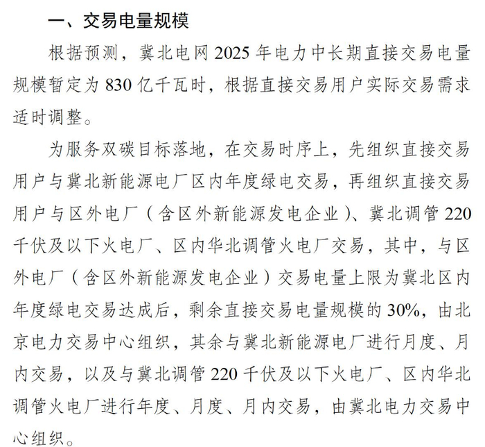 12月11日,河北省发展和改革委员会关于印发《冀北电网2025年电力中长期交易工作方案》的通知,对冀北电网2025年新能源入市电量安排如下: