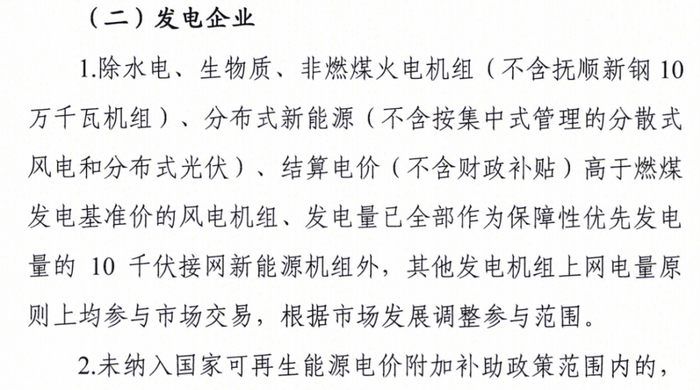 除分布式光伏、特殊类型的风电和光伏项目外,其他新能源项目,全部参与市场化交易,根据市场发展调整参与范围。