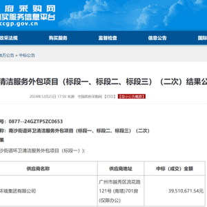 环卫在线网讯,2024年12月23日,广东省广州市南沙区人民政府南沙街道办事处发布南沙街道环卫清洁服务外包项目(二次)中标结果公告,项目分3个标段,中标供应商分别为广州环投环境集团有限公司、广州文远知行科技有限公司牵头联合体和深圳润高智慧产业有限公司牵头联合体,总项目金额可达9291.97万元,服务年限2年。