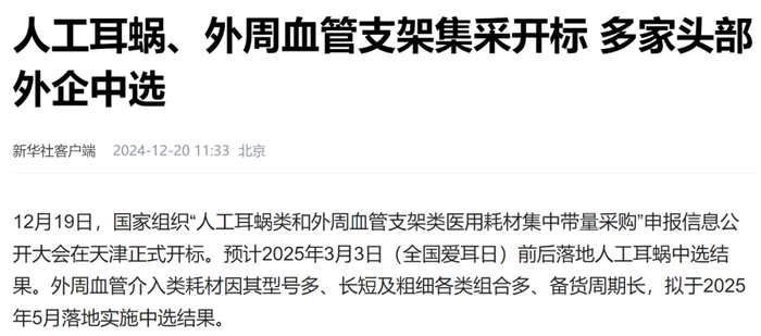 当然,外企在有利可图的领域还是积极报价的。在前几天国家组织的“人工耳蜗类和外周血管支架类医用耗材集中带量采购”中,有多家外企积极参与,最终的报价跟之前相比,也是降幅巨大。