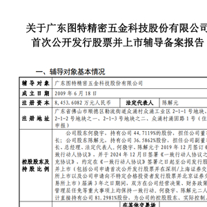 12月18日,广东图特精密五金科技股份有限公司(以下简称“图特股份”)在广东证监局办理辅导备案登记,拟首次公开发行股票并上市,辅导券商为民生证券。