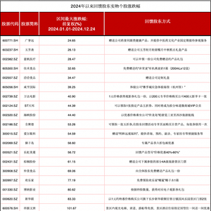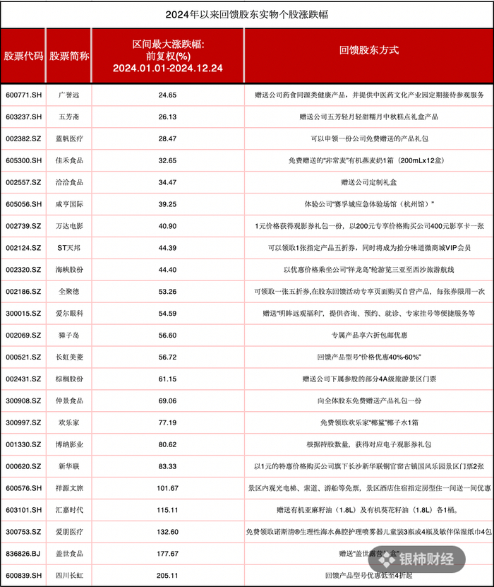 银柿财经统计,在本年度开展股东回馈活动的上市公司中,自年初至12月24日收盘期间,其股价区间最大涨幅均呈正值。其中,四川长虹表现最为突出,涨幅高达205.11%,位列榜首;广誉远的涨幅也达到了24.65%。这些个股区间最大涨幅的中位数为56.6%。