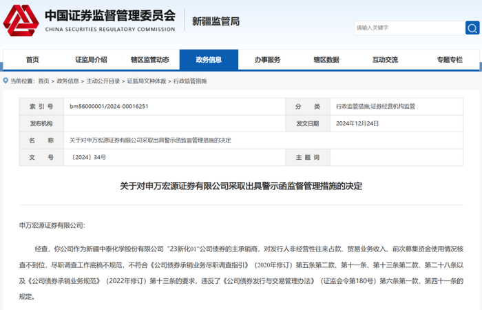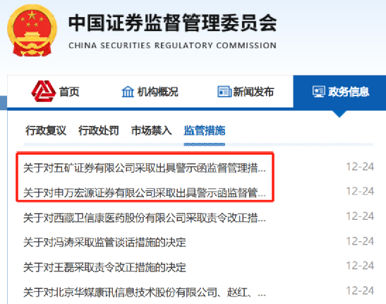 12月24日,证监会官网显示,新疆证监局对申万宏源证券、五矿证券采取出具警示函的监督管理措施。