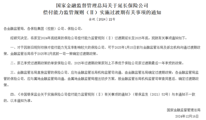 今年12月16日,金融监管总局发通知,原定于今年年底结束的规则Ⅱ过渡期,将延长至2025年底。