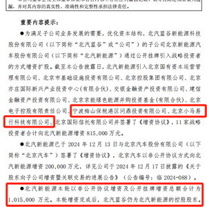 至此,北汽新能源合计完成101.5亿元的增资。12月13日,北汽蓝谷的控股股东北京汽车以非公开协议方式,向北汽新能源增资20亿元。