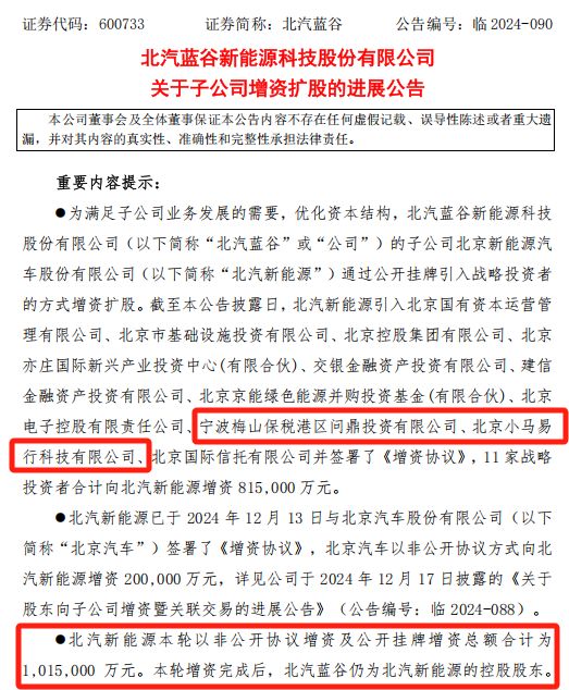 12月24日晚间,北汽蓝谷公告称,子公司北京新能源汽车股份有限公司(以下简称北汽新能源)完成增资扩股,合计获得81.5亿元增资,并且引入了宁德时代、小马智行旗下公司作为战略投资者。