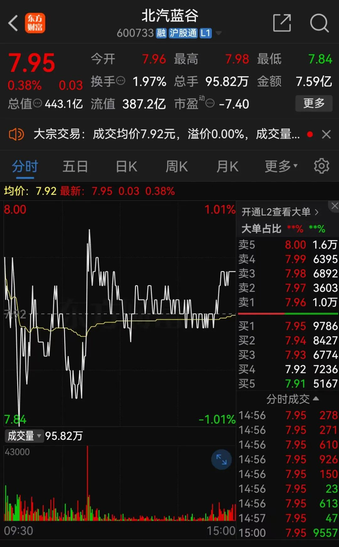 12月24日收盘,北汽蓝谷的股价报7.95元/股,总市值为443.1亿元。