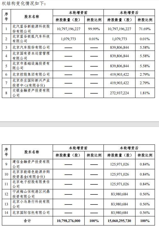 对比可见,北汽新能源增资扩股前的股东分别为北汽蓝谷、北京蓝谷极狐汽车科技有限公司,持股比例分别为99.99%、0.01%。