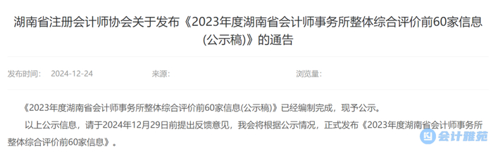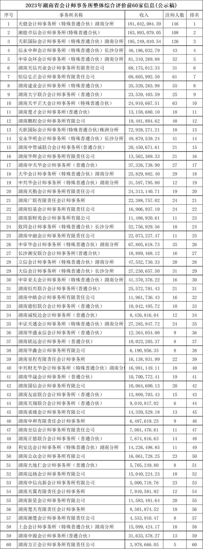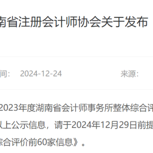 湖南省会计师事务所整体综合评价前60家信息(公示稿)